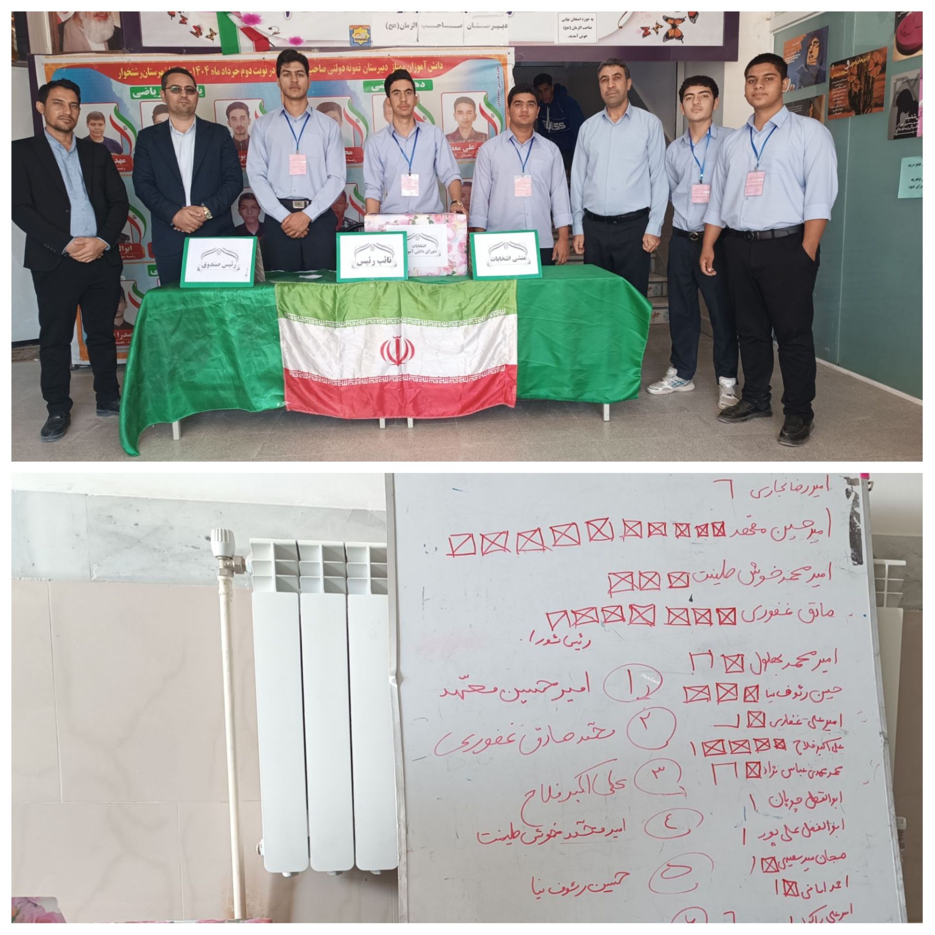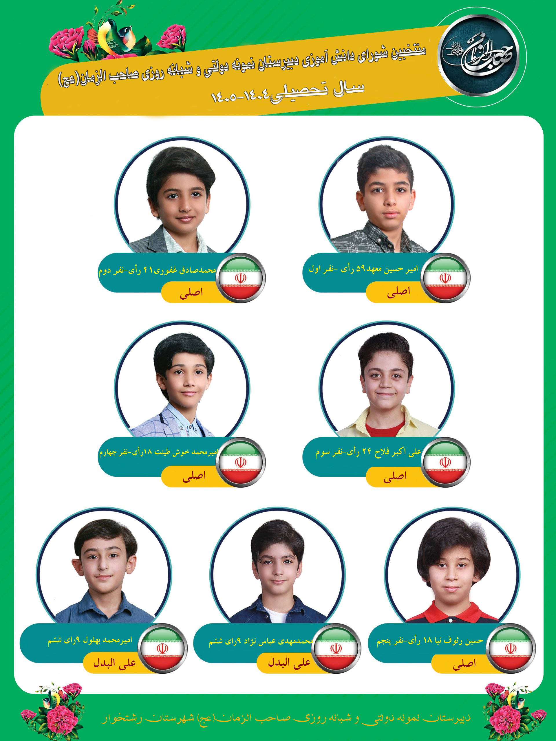 ضمن عرض تبریک به منتخبین شورای دانش آموزی ،نتیجه شمارش آرای انتخابات شورای دانش آموزی دبیرستان نمونه دولتی صاحب الزمان (عج) از ۳۰۸ رأی مأخوذه، افراد زیر حائز اکثریت آرا شده اند .